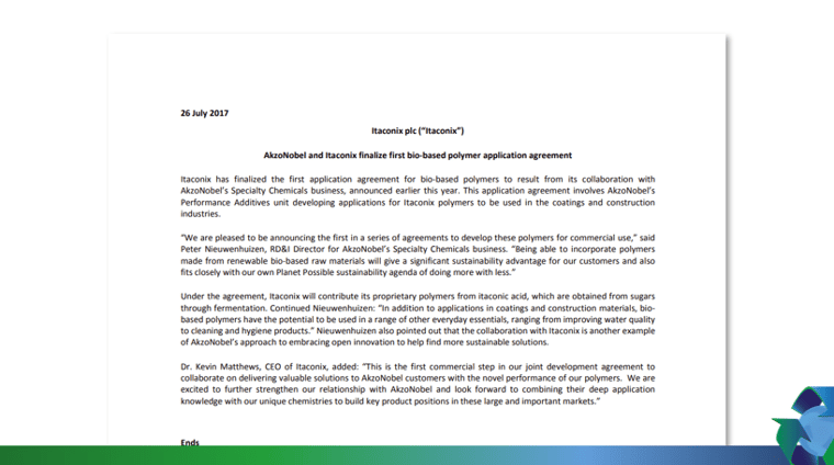 Dr. Kevin Matthews, CEO of Itaconix, added: "This is the first commercial step in our joint development agreement to collaborate on delivering valuable solutions to AkzoNobel customers with the novel performance of our polymers. We are excited to further strengthen our relationship with AkzoNobel and look forward to combining their deep application knowledge with our unique chemistries to build key product positions in these large and important markets."