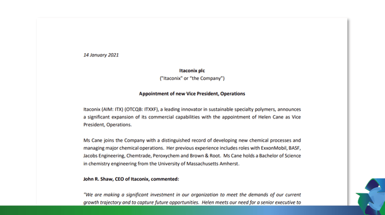 Itaconix (AIM: ITX) (OTCQB: ITXXF), a leading innovator in sustainable specialty polymers, announces a significant expansion of its commercial capabilities with the appointment of Helen Cane as Vice President, Operations.