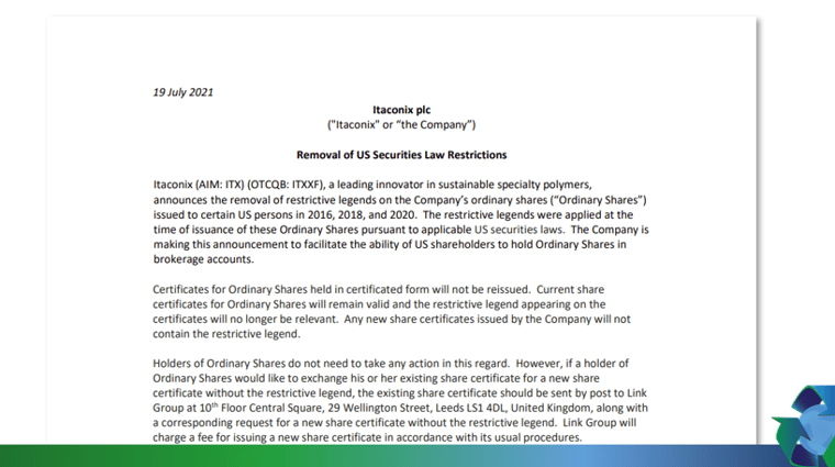 Itaconix (AIM: ITX) (OTCQB: ITXXF), a leading innovator in sustainable specialty polymers, announces the removal of restrictive legends on the Company’s ordinary shares (“Ordinary Shares”) issued to certain US persons in 2016, 2018, and 2020. The restrictive legends were applied at the time of issuance of these Ordinary Shares pursuant to applicable US securities laws. The Company is making this announcement to facilitate the ability of US shareholders to hold Ordinary Shares in brokerage accounts.