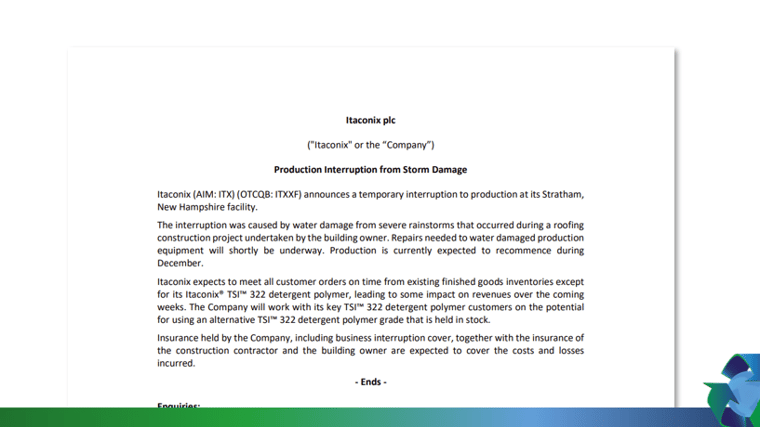Itaconix (AIM: ITX) (OTCQB: ITXXF) announces a temporary interruption to production at its Stratham, New Hampshire facility.