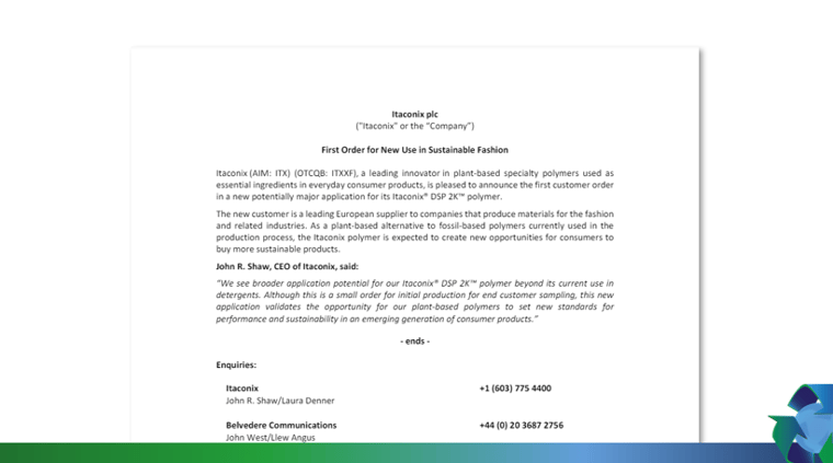 The new customer is a leading European supplier to companies that produce materials for the fashion and related industries. As a plant-based alternative to fossil-based polymers currently used in the production process, the Itaconix polymer is expected to create new opportunities for consumers to buy more sustainable products.