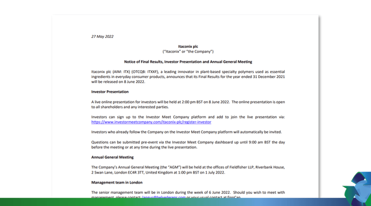 Itaconix plc (AIM: ITX) (OTCQB: ITXXF), a leading innovator in plant‐based specialty polymers used as essential ingredients in everyday consumer products, announces that its Final Results for the year ended 31 December 2021 will be released on 8 June 2022.