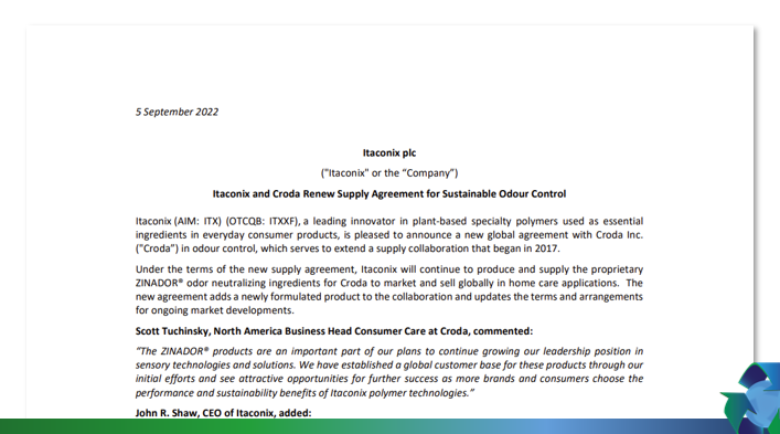 Itaconix (AIM: ITX) (OTCQB: ITXXF), a leading innovator in plant-based specialty polymers used as essential ingredients in everyday consumer products, is pleased to announce a new global agreement with Croda Inc. ("Croda”) in odor control, which serves to extend a supply collaboration that began in 2017.