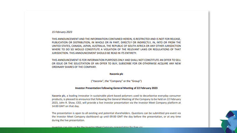 Itaconix plc, a leading innovator in sustainable plant-based polymers used to decarbonize everyday consumer products, is pleased to announce that following the General Meeting of the Company to be held on 22 February 2023, John R. Shaw, CEO, will provide a live investor presentation via the Investor Meet Company platform at 14:00 GMT on that day.