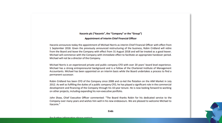 Itaconix announces today the appointment of Michael Norris as interim Chief Financial Officer with effect from 1 September 2018. Given the previously announced restructuring of the business, Robin Cridland will retire from the board and leave the Company with effect from 31 August 2018 and will be treated as a good leaver. Michael will commence with the Company with immediate effect to facilitate an appropriate handover period. Michael will not be a director of the Company.