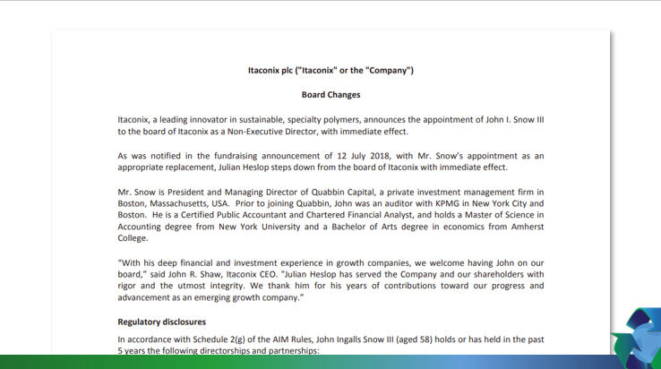 Itaconix, a leading innovator in sustainable, specialty polymers, announces the appointment of John I. Snow III to the board of Itaconix as a Non-Executive Director, with immediate effect.