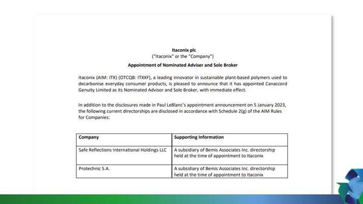 Itaconix (AIM: ITX) (OTCQB: ITXXF), a leading innovator in sustainable plant-based polymers used to decarbonise everyday consumer products, is pleased to announce that it has appointed Canaccord Genuity Limited as its Nominated Advisor and Sole Broker, with immediate effect.