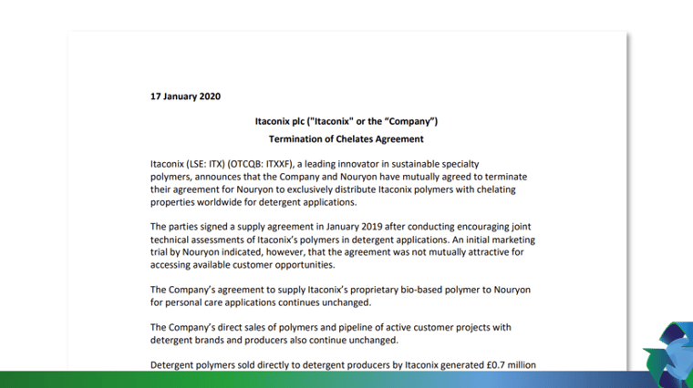 Itaconix (LSE: ITX) (OTCQB: ITXXF), a leading innovator in sustainable specialty polymers, announces that the Company and Nouryon have mutually agreed to terminate their agreement for Nouryon to exclusively distribute Itaconix polymers with chelating properties worldwide for detergent applications.