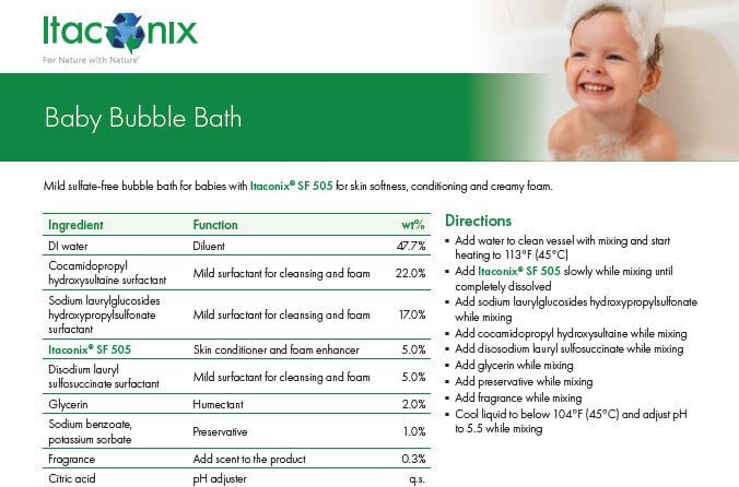 Formulators and brand managers, use Itaconix's formula to create high-performance plant-based Baby Bubble Bath.