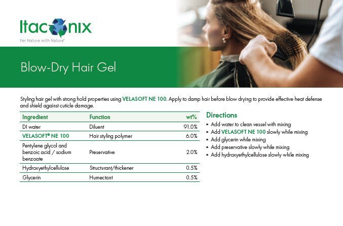Formulators and brand managers, use Itaconix's formula to create high-performance plant-based Blow-Dry Hair Gel.