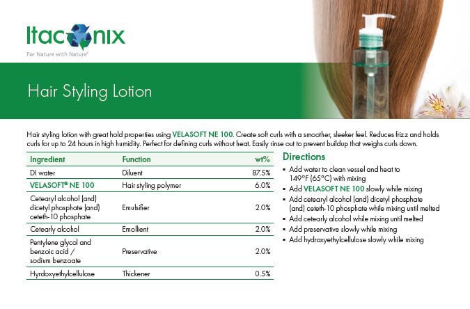 Formulators and brand managers, use Itaconix's formula to create high-performance plant-based Hair Styling Lotion.