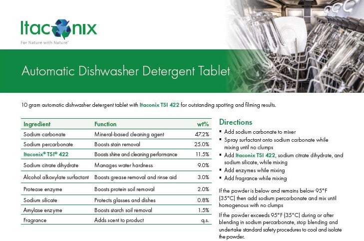 Formulators and brand managers, use Itaconix's formula to create high-performance plant-based Automatic Dishwasher Detergent Tablet.