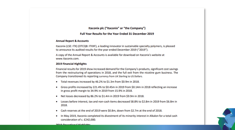 John R. Shaw, CEO of Itaconix, stated: "Our 2019 results show the transformation in revenue and profit potential that we created from our focus on sustainable specialty ingredients and the restructuring of