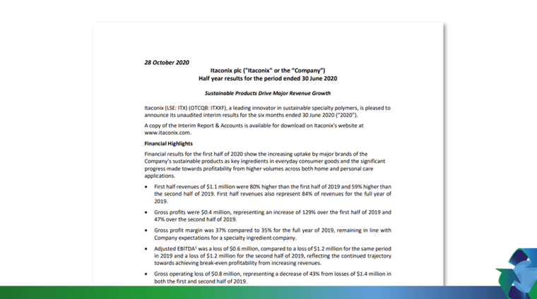 Itaconix (LSE: ITX) (OTCQB: ITXXF), a leading innovator in sustainable specialty polymers, is pleased to announce its unaudited interim results for the six months ended 30 June 2020 (“2020”).