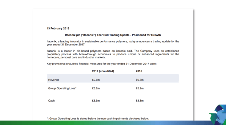 Itaconix, a leading innovator in sustainable performance polymers, today announces a trading update for the year ended 31 December 2017.