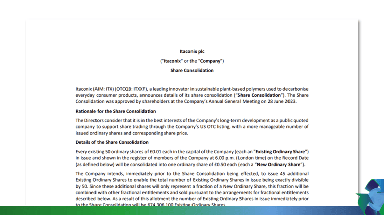 Itaconix (AIM: ITX) (OTCQB: ITXXF), a leading innovator in sustainable plant-based polymers used to decarbonise everyday consumer products, announces details of its share consolidation (“Share Consolidation”). The Share Consolidation was approved by shareholders at the Company’s Annual General Meeting on 28 June 2023.