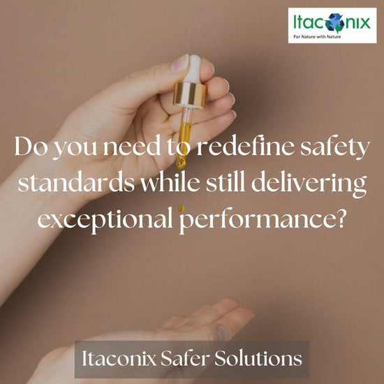 At Itaconix, safety is a fundamental attribute. We work with brand managers and product formulators to improve performance and sustainability of their products while reducing ingredients that are unsafe to create or use. Our plant-based ingredients and formulations help you create beauty, cleaning and hygiene products that prioritize user health and wellness without compromising on cost or efficacy. Let’s discuss how your product brief can provide a secure product formulation with lower-to-no toxicity along with higher performance.