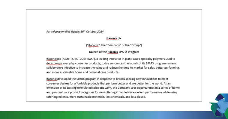 Itaconix plc (AIM: ITX) (OTCQB: ITXXF), a leading innovator in plant-based specialty polymers used to decarbonise everyday consumer products, today announces the launch of its SPARX program - a new collaborative initiative to increase the value and reduce the time-to-market for safer, better performing, and more sustainable home and personal care products.