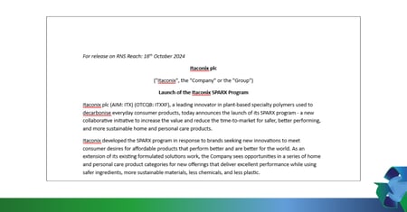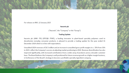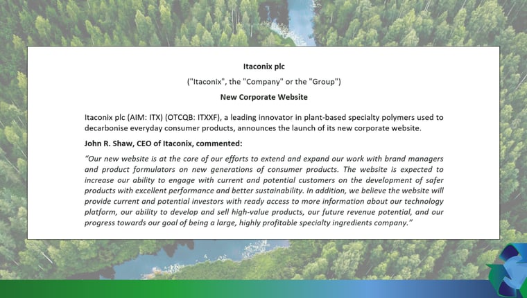 Itaconix plc (AIM: ITX) (OTCQB: ITXXF), a leading innovator in plant-based specialty polymers used to decarbonise everyday consumer products, announces the launch of its new corporate website.