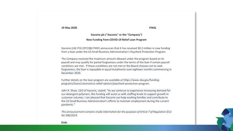 Itaconix (LSE:ITX) (OTCQB:ITXXF) announces that it has received $0.2 million in new funding from a loan under the US Small Business Administration’s Paycheck Protection Program.
