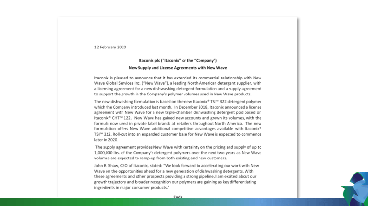 The new dishwashing formulation is based on the new Itaconix® TSI™ 322 detergent polymer which the Company introduced last month. In December 2018, Itaconix announced a license agreement with New Wave for a new triple-chamber dishwashing detergent pod based on Itaconix® CHT™ 122. New Wave has gained new accounts and grown its volumes, with the formula now used in private label brands at retailers throughout North America. The new formulation offers New Wave additional competitive advantages available with Itaconix® TSI™ 322. Roll-out into an expanded customer base for New Wave is expected to commence later in 2020.
