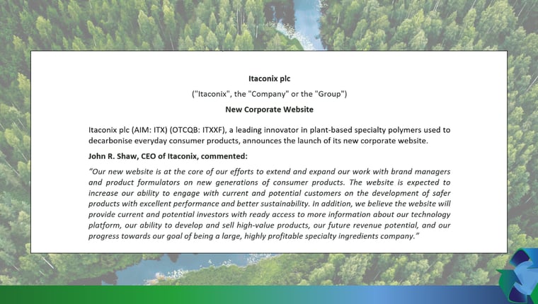 About Itaconix Itaconix uses its proprietary plant-based polymer technology platform to produce and sell specialty ingredients that improve the safety, performance, and sustainability of consumer products. The Company's current ingredients are enabling and leading new generations of products in detergents, hygiene, and hair care. Itaconix's products contribute to the global low carbon economy.