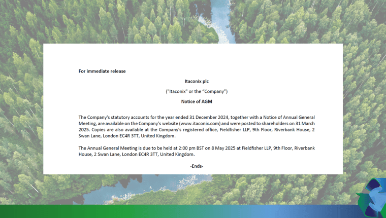 The Company's statutory accounts for the year ended 31 December 2024, together with a Notice of Annual General Meeting, are available on the Company's website (www.itaconix.com) and were posted to shareholders on 31 March 2025. Copies are also available at the Company's registered office, Fieldfisher LLP, 9th Floor, Riverbank House, 2 Swan Lane, London EC4R 3TT, United Kingdom.