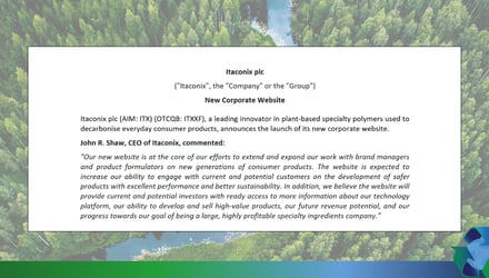 Itaconix (AIM: ITX) (OTCQB: ITXXF), a leading innovator in sustainable plant-based polymers used to decarbonize everyday consumer products, announces that its Preliminary Results for the year ended 31 December 2024 will be released on 31 March 2025.