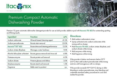 9 gram automatic dishwasher detergent powder for use as powder, pod or tablet with Itaconix TSI 422 for outstanding spotting and filming results.