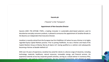 Investor News Itaconix plc Appoints Jonathan Brooks to Board of Directors