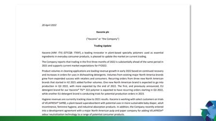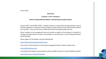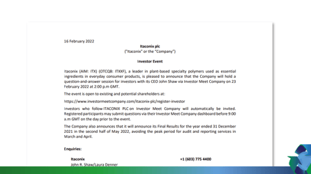 Investor News ITACONIX PLC FULL YEAR RESULTS FOR THE YEAR ENDED 31 DECEMBER 2021