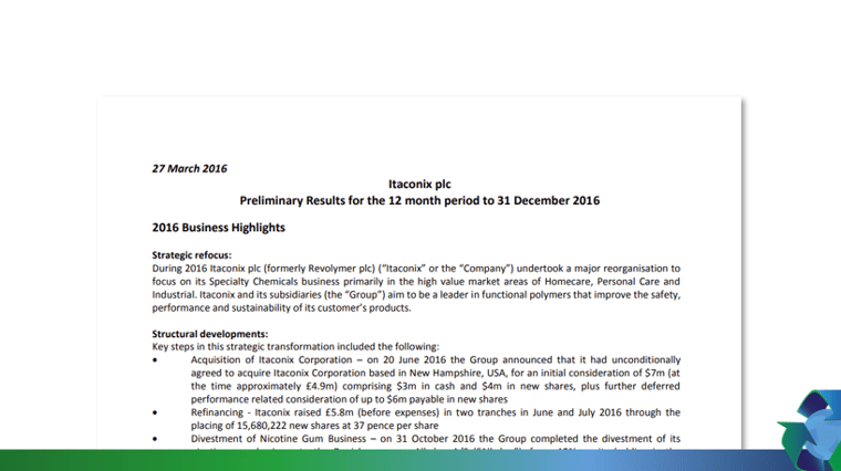 - Acquisition of Itaconix Corporation – on 20 June 2016 the Group announced that it had unconditionally agreed to acquire Itaconix Corporation based in New Hampshire, USA, for an initial consideration of $7m (at the time approximately £4.9m) comprising $3m in cash and $4m in new shares, plus further deferred performance related consideration of up to $6m payable in new shares