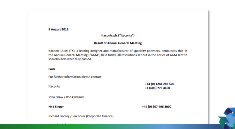 Itaconix (AIM: ITX), a leading designer and manufacturer of specialty polymers, announces that at the Annual General Meeting (“AGM”) held today, all resolutions set out in the notice of AGM sent to shareholders were duly passed.