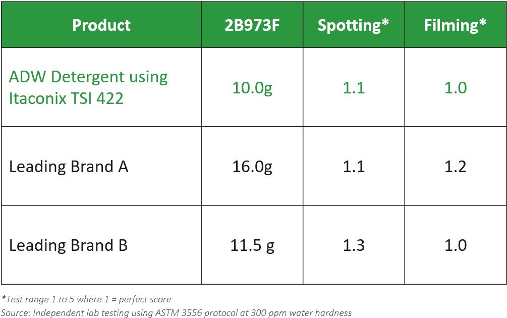 Achieve top performance and sustainability using Itaconix TSI 422 in combination with sodium citrate in automatic dishwasher detergent formulations.